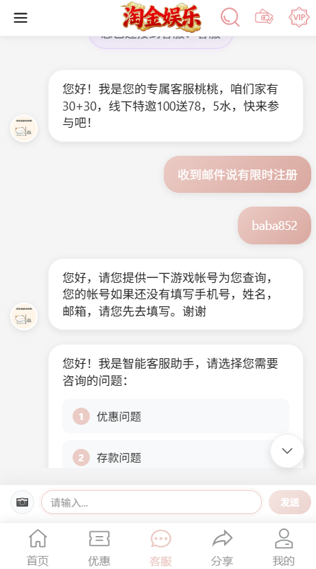 淘金娱乐限时彩金10快冲。先注册账号个人资料绑定手机号,邮箱号,还有姓名就行了然后直接去客服申请(我刚领到)没打出来
